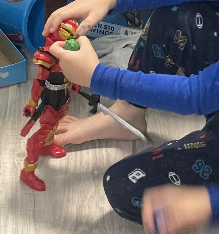 My son has a few of the different types of 12” action figures, and this Dino power ranger is his new favorite. This red beast comes with weapons, and an added twist. If you squeeze his legs together, his torso spins around and he lights up. A very good way to punch out his other 12” action figure bad guys! It’s made well, and and very sturdy!
