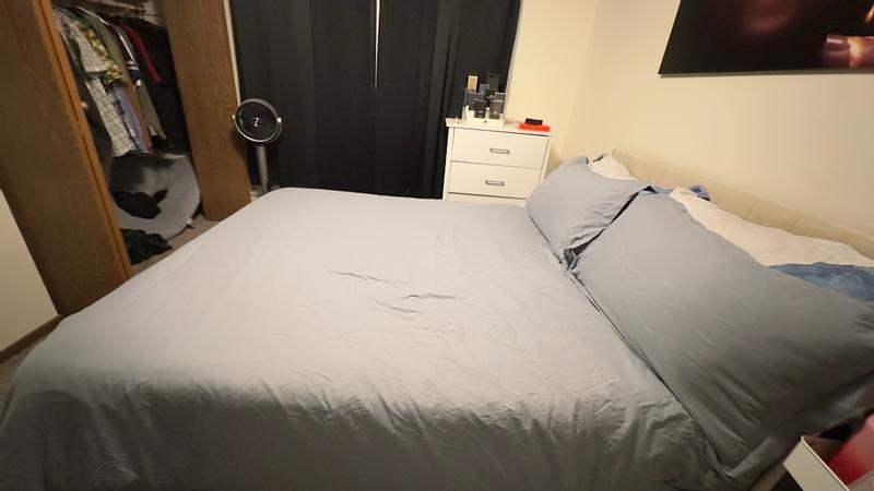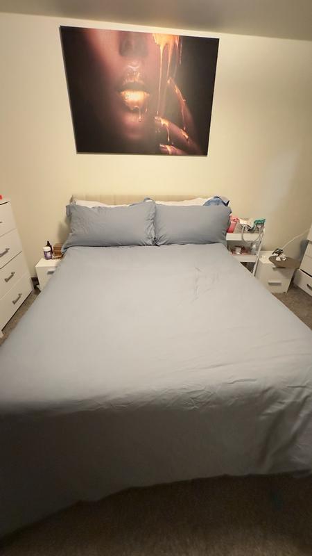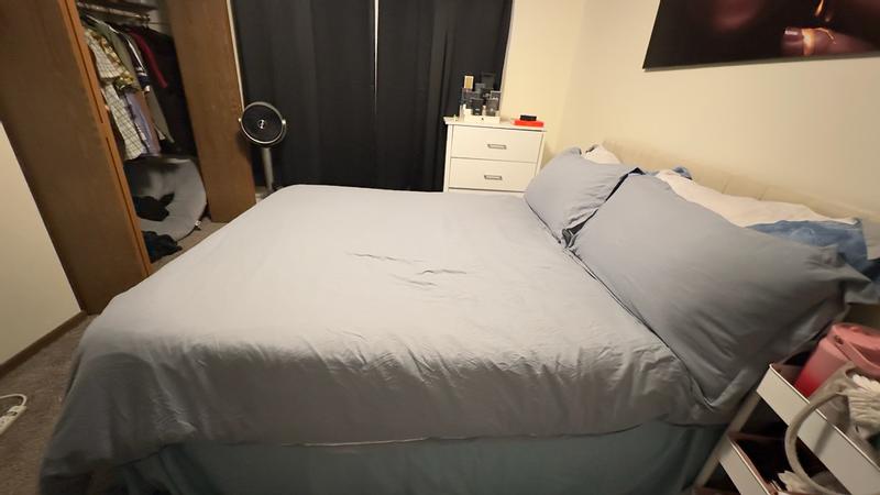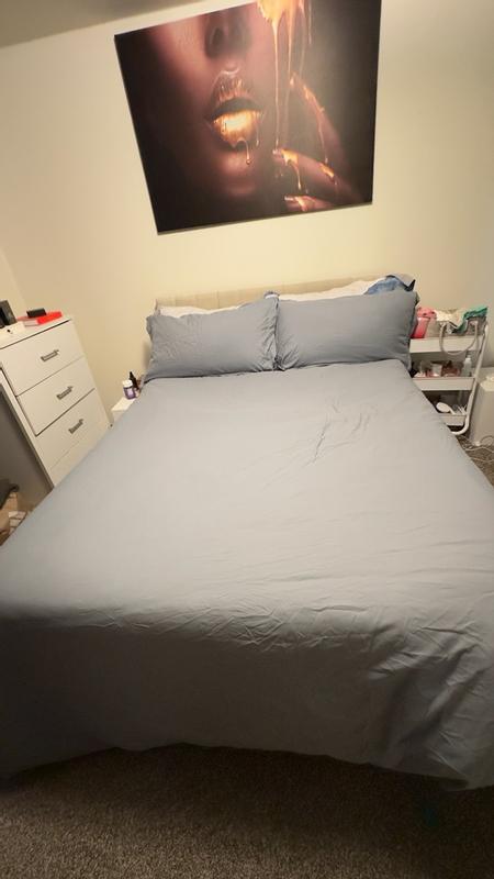 This duvet cover set is soft, comfortable, and looks great in steel blue. It’s easy to put on with the zipper closure, and the matching pillow shams make the bed look put-together. The material is smooth and holds up well after washing, without much wrinkling. It’s thin but durable and feels nice to sleep on, offering good value for the price.
