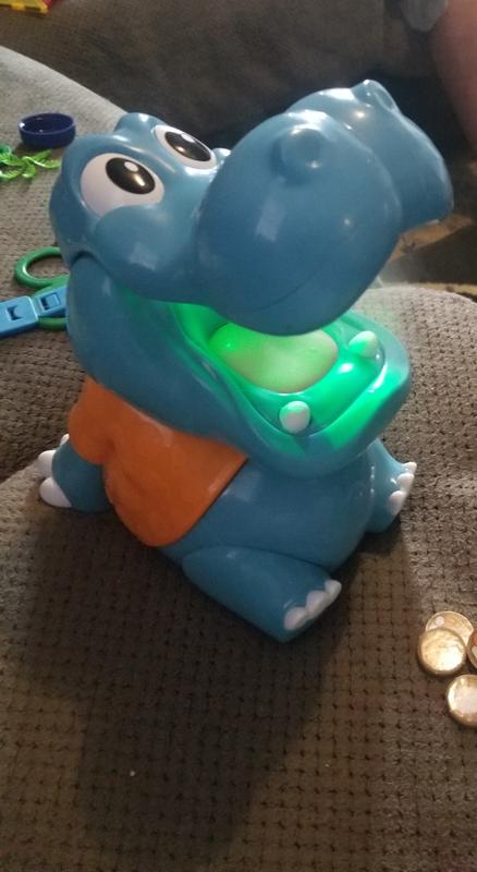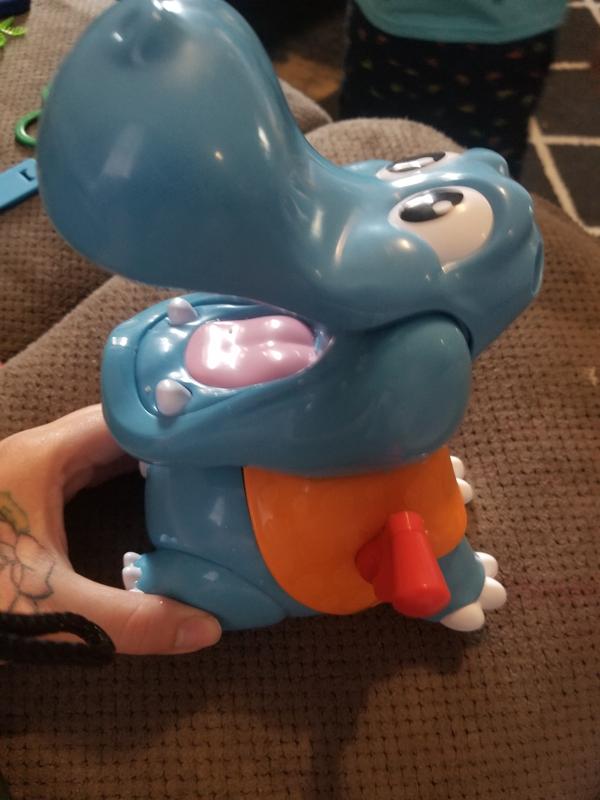 My two year old daughter really loves to play this game. It requires batteries which aren't included. The hippo burps some kind of steam out. There's a liquid cartridge thing included that you put in the hippo. That's how he burps. It's actually a fun little game for kids.