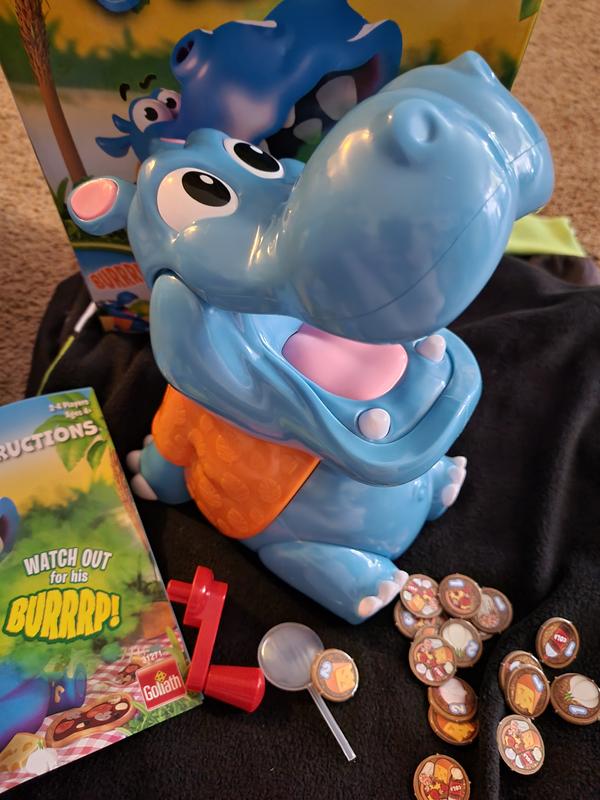 I got this game for my 5 yr. old Granddaughter and she absolutely loves it! You draw a food after guessing what ii is and if you are wrong you have to feed the hippo and turn the handle...hoping he doesn't burp. When he burps a green light and a light water mist comes out. This is also fun for adults..I really enjoyed it. I would definitely recommend this to anyone.