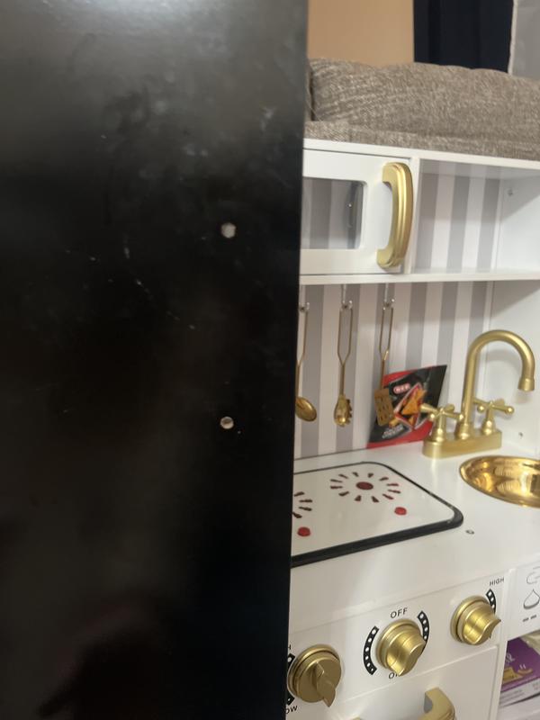 I purchased this kitchen as a Christmas gift and was satisfied with the purchase at first. We’ve now had to re-attach the refrigerator door handle multiple times. It appears to be screwed back in but separates as soon as it’s opened.