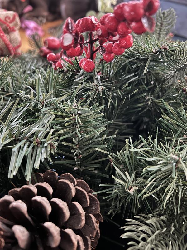 This wreath arrived and it was already breaking apart. The little cherries break off easily and the branches with the pinecones are not flexible which makes it hard to reposition. The quality is not at all what I expected.
