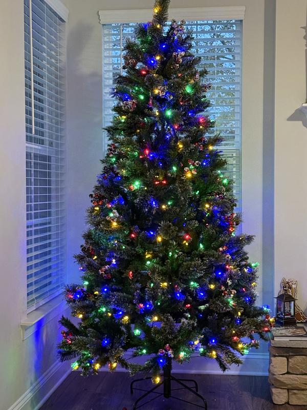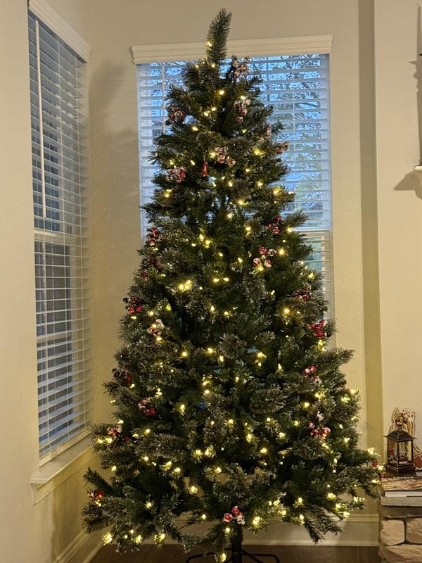 Web ID: 19343452Give your holiday decor a never-before appeal with this 7.5 ft. Pre-Lit Snowy Iowa Pine Christmas Tree. Guaranteed to be an immediate eye-catcher, this artificial Christmas tree has a distinctly beautiful design. It includes 400 Dual Color LED Lights that illuminate your home with a festive glow while also saving you the time and trouble of stringing bulbs onto the tree. Switch between different functions with a convenient foot pedal to change the look of this tree during the holiday season. Assembly is easy - just connect the tree's sections, fluff the branches, and plug in the lights for a show-stopping holiday centerpiece. A sturdy steel stand keeps the tree and all its decorations stable, preventing the risk of tipping over. Made with strong and durable steel components and red berry accents, this item is built to last. Flame retardant and hypoallergenic materials make it a safer choice when compared to real trees.