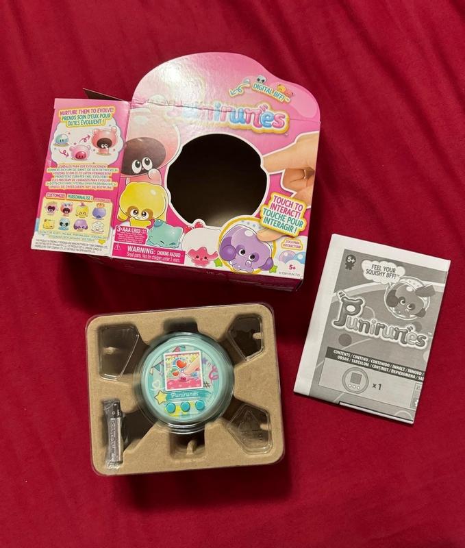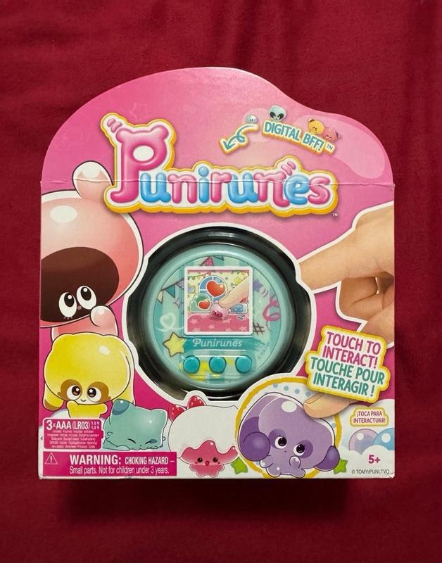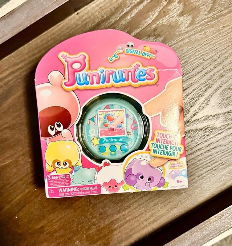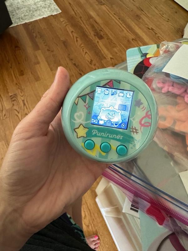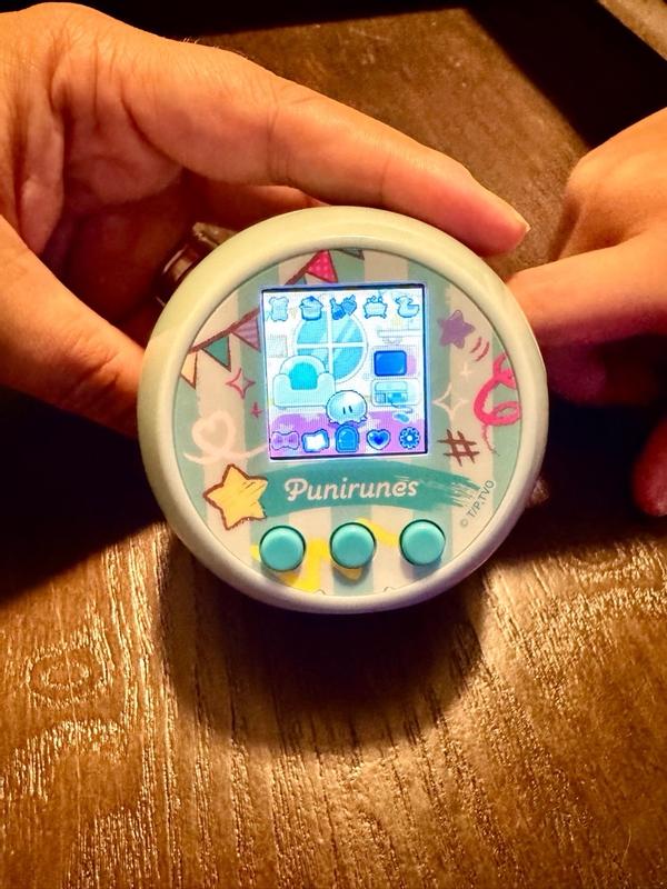 Punirunes is an adorable and original virtual pet that takes the whole concept of user interaction with their pet to another level! The squishy button inside the device functions as a pad which can be used to pet your punirunes, play games with them and also taking care of them. Just be careful to always wash your hands and keep them clean when interacting with the pad because it's silicone and dirt will get stuck on it if your hands are dirty. I also love the evolution tree and all the posible combinations you can do with the mix materials. The animations are beautiful and cute for every punirune, the sound is also very high quality and has cute sound effects. The screen also is very bright and big enough so you can watch the gorgeous colours with detail! As for the size, I have big hands, and it totally fills my handful and feels very nice to hold. An excellent virtual pet overall perfect for kids and adult fans of virtual pets, I hope new versions release worldwide soon!
