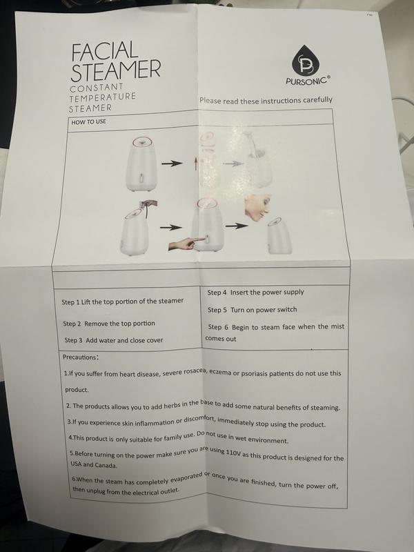 While the concept of this product is very appealing, the execution requires improvement. Like other customers mentioned, there is no direction as to how much water needs to be poured. The steam is very hot, so you need to be careful when bringing your face close to the steamer. Also, I am afraid it is made out of cheap plastic as it smells unpleasantly.
