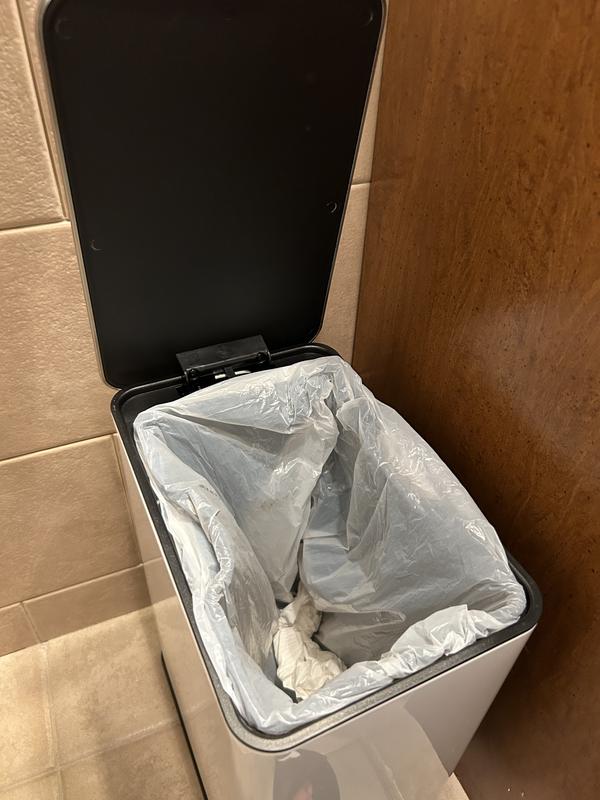 This small trash can is perfect for a bathroom. It is small but not tiny. I always think it’s difficult to imagine the size of a trash can by the gallon size given; this one is small, probably not for use in a kitchen. I like the step-on feature that will conceal the contents and keep your bathroom looking tidy and nice. The can liner is great, allows for easy emptying and cleaning. I love the clean white color, my bathroom has white cabinets, so it blends in and doesn’t stand out. The small loop on the back allows for easy maneuvering and is a convenient addition to the trash can. It is has some weight to it, so when you step on lift, it doesn’t flip or move the can around, it stays in place. I think it is a great trash can that looks sleek and posh in my bathroom.