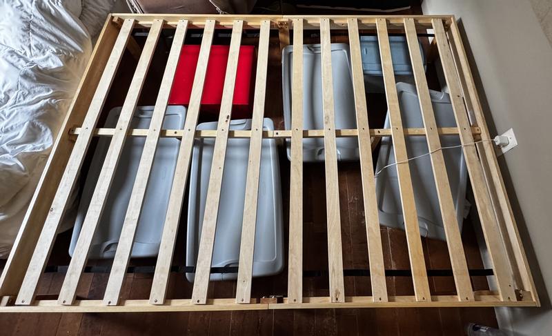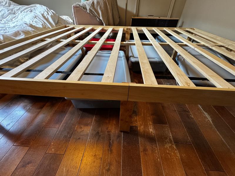 Web ID: 22229163Revamp your bedroom with our wooden platform bed frame! Made of plywood slats with firm connection, the wooden bed frame is built to last. And the solid rubber wood support legs enhance overall stability. With ample space under bed, you can conveniently place suitcases or shoe boxes. Moreover, 10.5" spacing allows sweeping robot to easily clean the floor. Thanks to its simple and concise style, the modern platform bed is an ideal addition for master s bedroom, guestroom, kid s room.