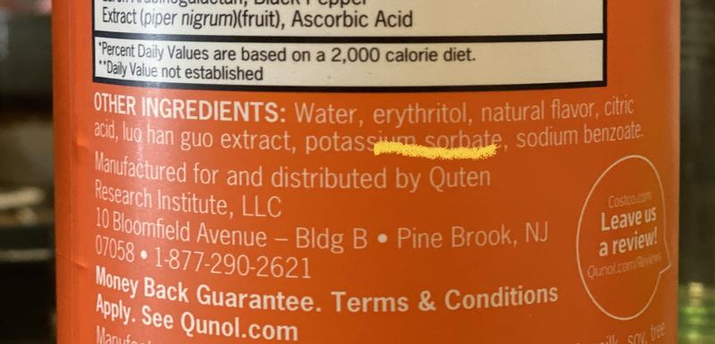Really dislike this product because even a minimal amount of this liquid inadvertently left on fingers will easily and stubbornly stain clothing, electric toothbrushs, wall paints, etc. Yes, I'm sure Qunol will respond with "wash your hands!" to which I agree. However I have even had the dried crystals at the cap fall and stain my footwear. The answer for me is to now purchase capsules ONLY.
