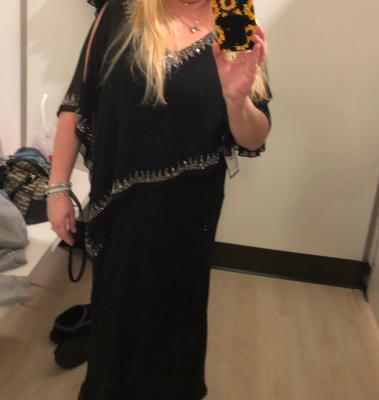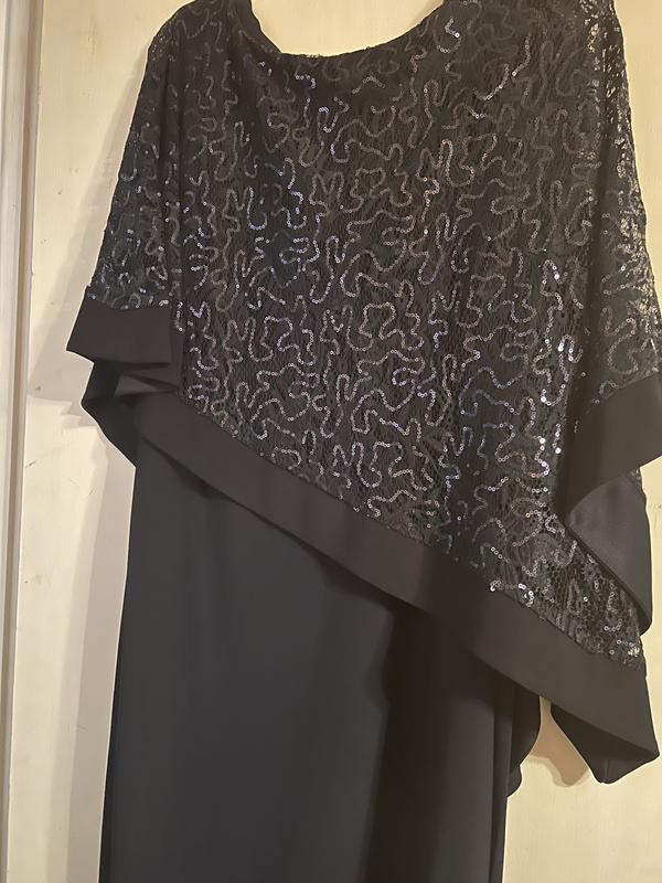 Well made dress and very flattering. Love the color and sparkly cape, which is sewn on, so it won’t slip off. The dress is soft, stretchy jersey-like fabric, and very comfortable. The side slit goes up, just above the knee. True to size. I’m 5’4”, 140 lbs. and ordered an 8.