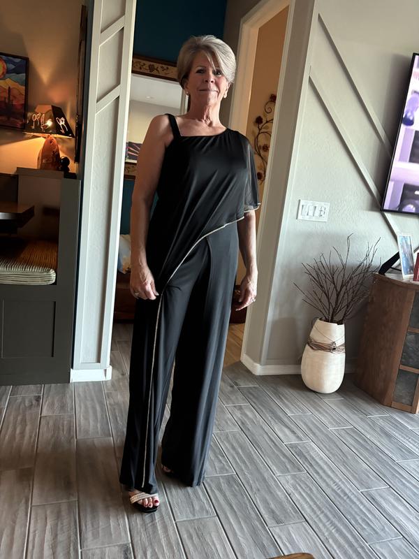Web ID: 20218140An ideal option for your next special event, this chic jumpsuit from R & M Richards features an elegant and modern asymmetric draped sheer overlay and sparkling rhinestone trim for a glam finish.