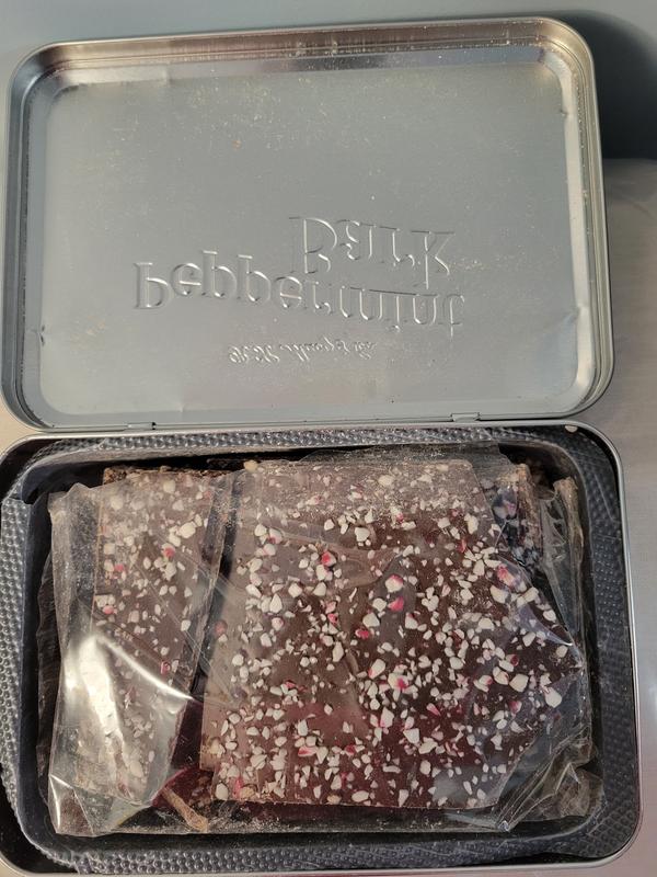 Tins were dirty, dented, and opened. The plastic that holds the bark was opened. This is totally unacceptable. I was very disappointed with this shipment. The bark is sold out, and I will receive a refund. To add insult to injury, the email says "RETURN ITEMS TO MACY'S STORE"!!! Why do I have to drive to Macy's to return items that shipped to me damaged?? The description reads "food items cannot be returned" Buyer beware of final sale, and clearance food items.