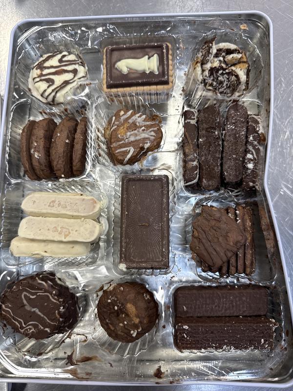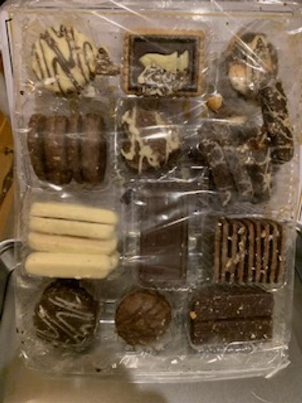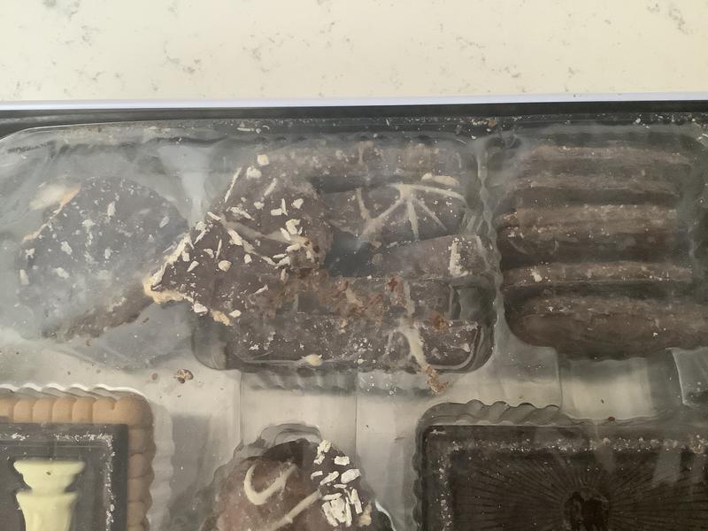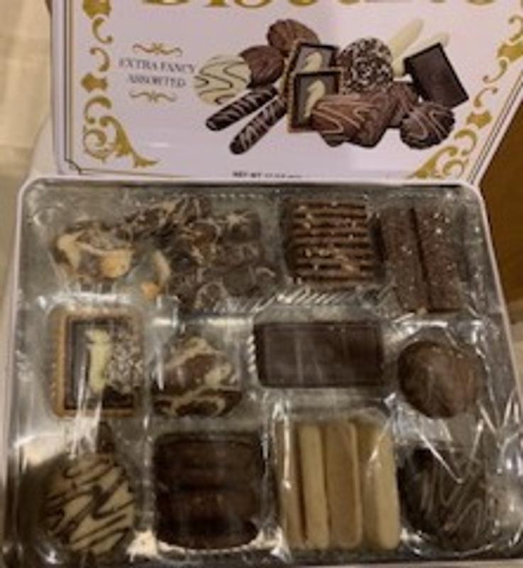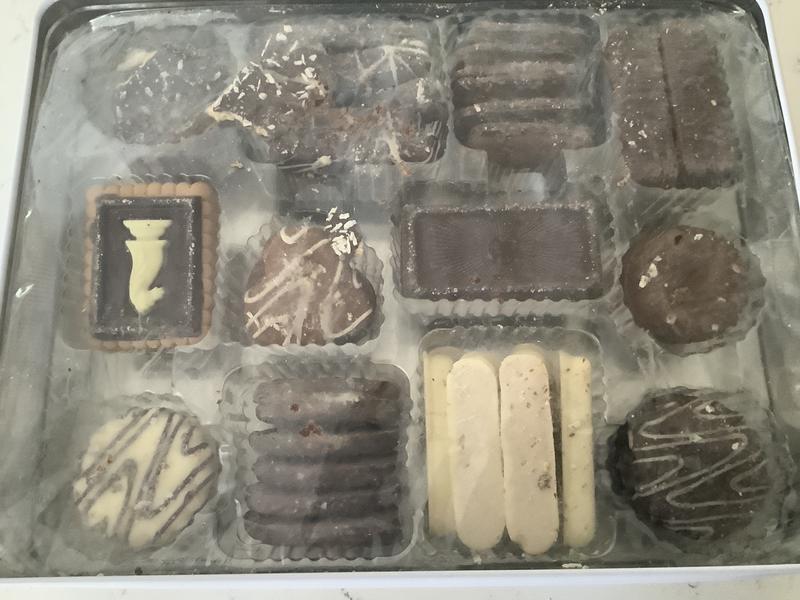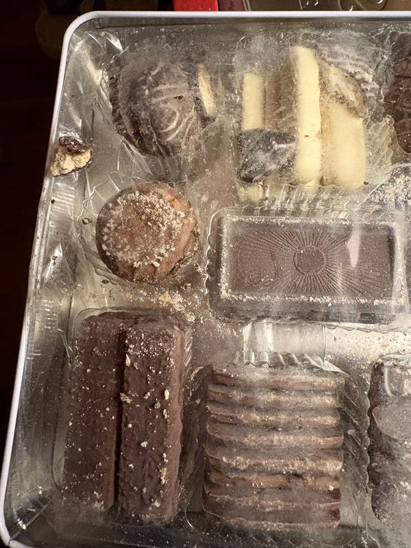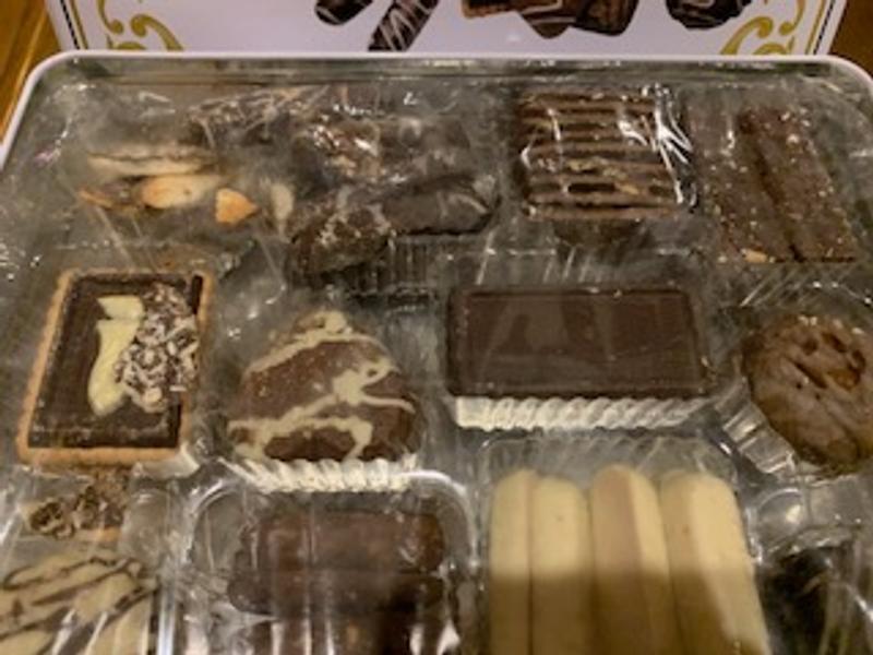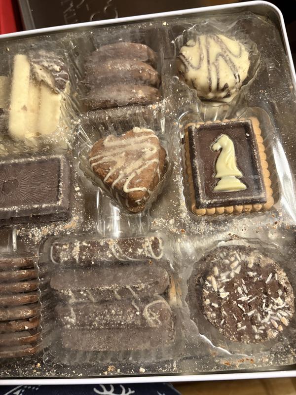 Arrived somewhat melted, cookies stuck together, with several broken in spite of packaging inside tin. Cookies had very little flavor but the chocolate was ok tasting.
