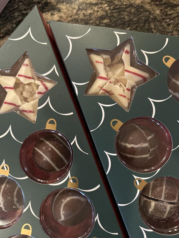 I was totally stunned when I recieved these 3 Sets of Cocoa Bombs that I ordered as Christmas gifts from Macys..Shipped in a box TW Ice the size is the items there was very little internal packaging to protect the cocoa bombs. The 3 boxes were opened and the candy rolling around in their plastic trays. Where is the quality control for Macys? Because I could not use these as intended gifts I had to return. Sad that such a great quality name has fallen to this level!! I would have never expected this from this company as we consistently purchase items from them..