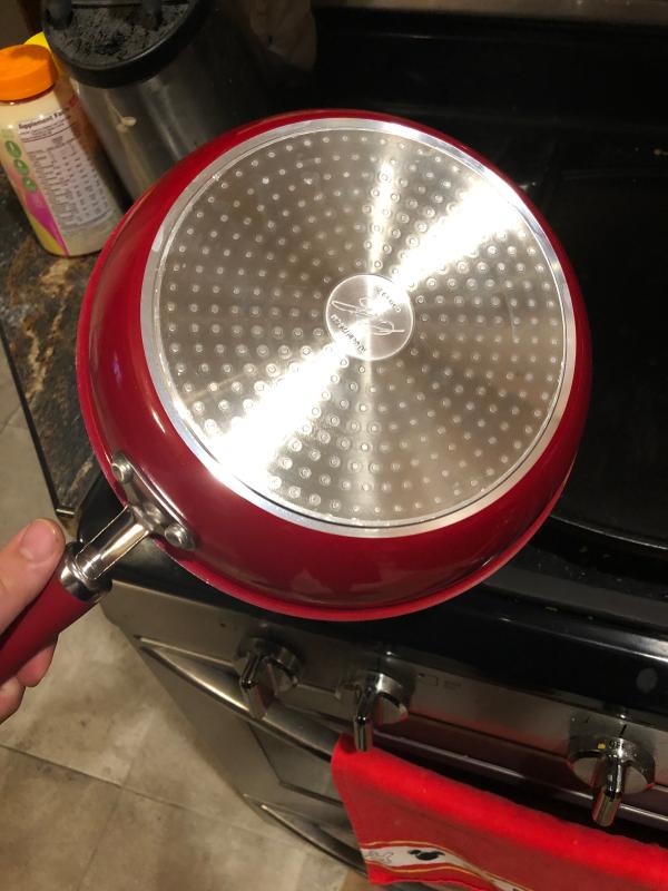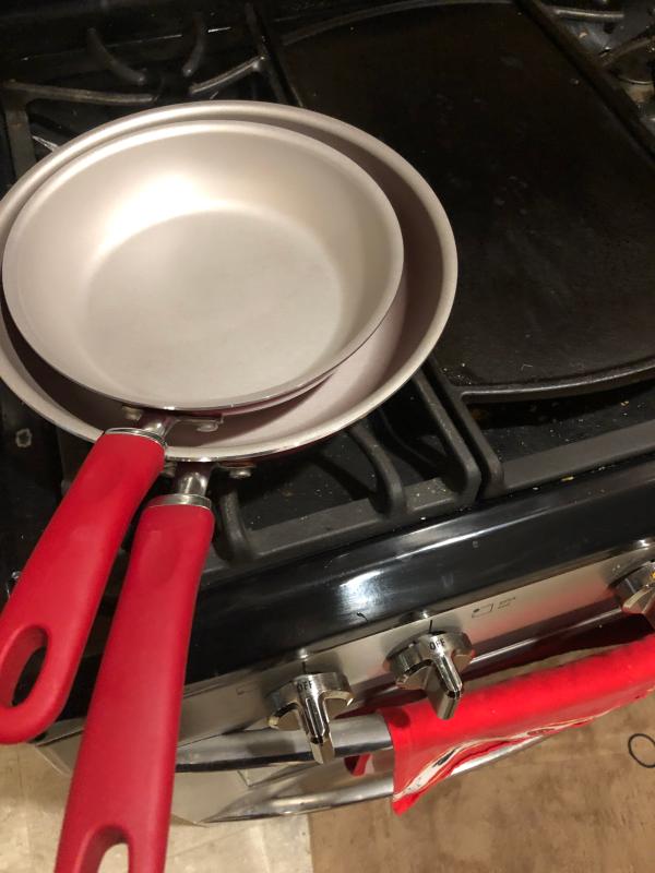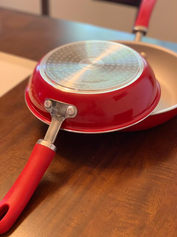 I love using this Racheal Ray two piece skillet set. The beautiful deep red color with a touch of sparkle throughout looks stunning with my other red kitchen decor. Both skillets are well designed and durable. The comfortable handle on this skillet set allows me to have complete control of the skillets and keeps cool to touch even when cooking on high heat. Both skillets have depth making it ideal to use when cooking for my family of four giving me plenty of room to stir-fry, make gravy and other meals that require a deep cut. One of my favorite feature with this skillet set is the induction-suitable base feature. The induction-suitable base creates a fast heat up time and an all over even heat control. I love the way my food cooks in these skillets and clean up is easy because of the nonstick surface.