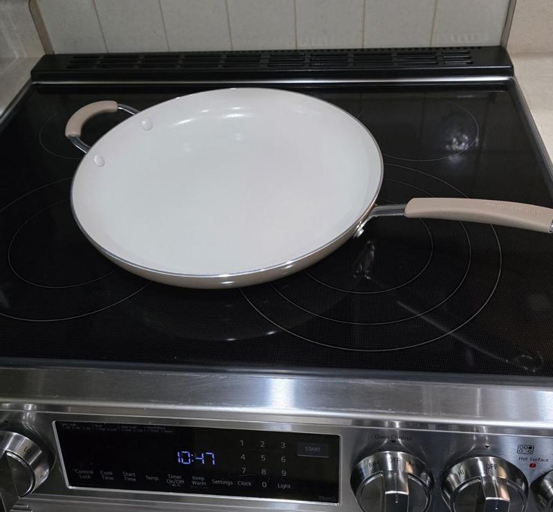 This pan was bigger than I expected and I love it. The ceramic surface heats pretty evenly on the stove and pan frying works well with it. I only need to use a minimal amount of oil which helps us cut down on oil usage which is a plus. The large surface area is good for not only stir frying but also making larger omelettes and such. I have not experienced food sticking to the pan which has made hand washing the pan quick and simple. Overall this is a good everyday pan and I would consider getting additional pots and pans from this brand.