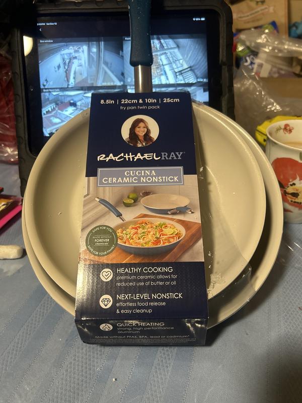 I knew the pan would be 14 inches, but it was still bigger than I expected and worried it wouldn’t heat up correctly on my stovetop. That being said, the Rachel Ray Ceramic pan heated evenly and got hot fairly quickly. I used it to make tortillas (they start as dough and cook). The color is neutral and goes with everything. I love that it can go in the oven up to 400 degrees. It’s large but heats up quickly and evenly. Easy to wash and maintain.
