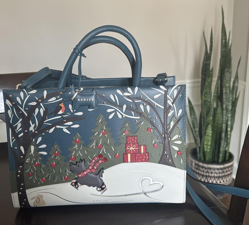 I love this Radley Christmas bag! It is so cute! I also love the 3 different areas of storage organization that it has. I can keep my make-up and extra meds in the middle zip pocket along with my pens. I love the 3 slip pockets contained within that zip pocket. The pockets on each side of the zip pocket are roomy enough for a full sized wallet and my car fob and keys go in the pocket on the other side. There is also a slip pocket on the outside back of the bag that is the perfect size for my phone. I like that it can be carried as a handbag or one can use the strap as a cross body when your hands are full or just for a feeling of safety. It is a sturdy bag and has the cute little Scotty on the front which I love. I own Scottie’s, so of course I had to have this bag. It is adorable!