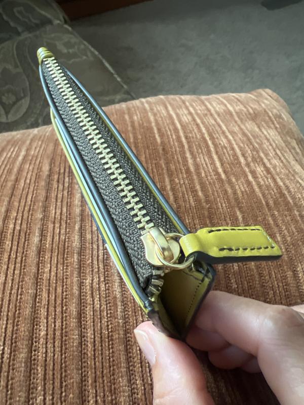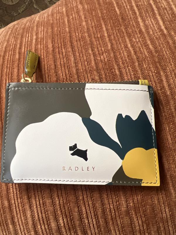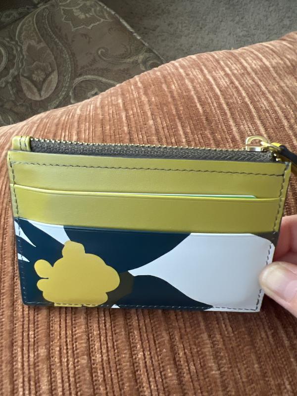 A bold floral print adorns the smooth leather of the Perfect Poppies mini zip-top coin purse. This compact shape offers an abundance of space for coins inside and exterior slots for your cards. Finished with our Scottie mascot.