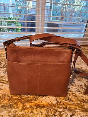 Love this medium size crossbody. The curved pocket in the front easily fits my large cell phone. Convenient to slide it in and out when I am on the go. Use middle slot to drop my car keys in. The two zippered pockets are ample size for everything else.