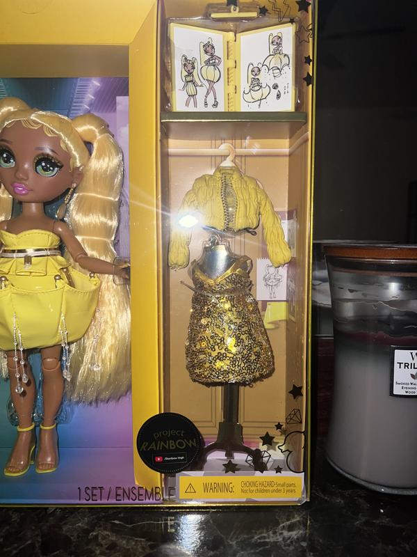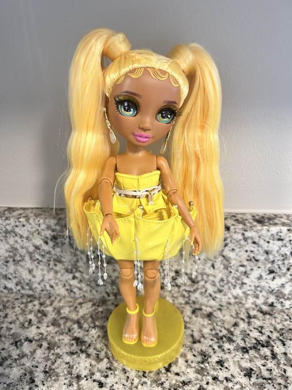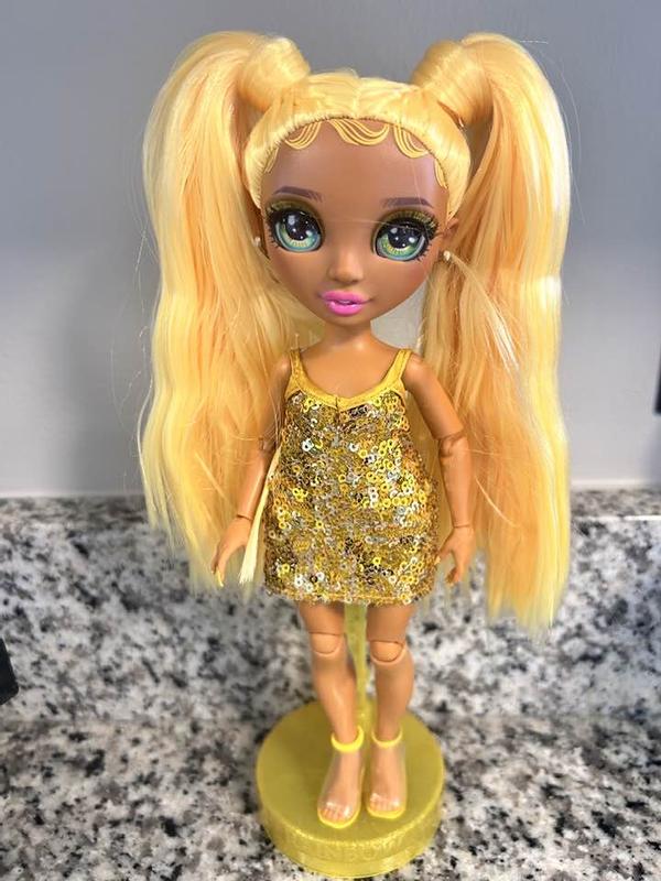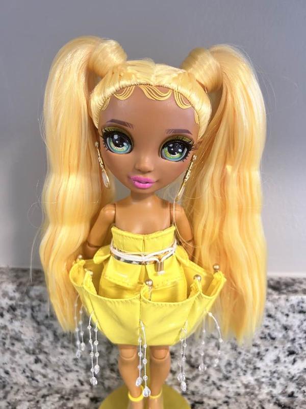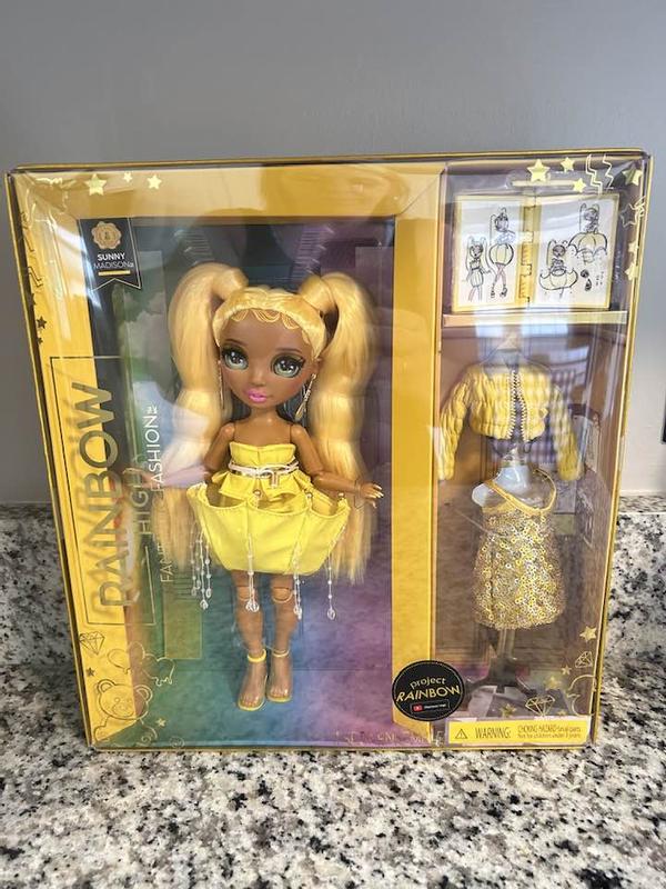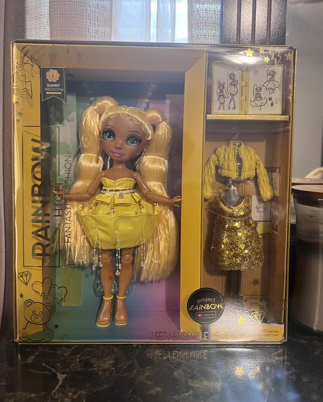 My little one loves this Rainbow High Fantastic Fashion Sunny Madison 11" fashion doll. Madison doll comes with lots of accessories like a gold sparkling dress and yellow puff coat with fashion book. Madison has long blonde hair and ear rings. She comes dressed in a yellow short dress and yellow shoes. She is so adorable. My 5 year old adores her. HIGHLY RECOMMEND!