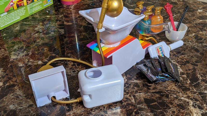 My little girl loves doing her dolls hair so she was super excited to get this hair wash station with dyes. I was hesitant about the dyes but it wasn’t messy and easy to clean up. Even though we are out of dye she still washes her dolls hair with this!