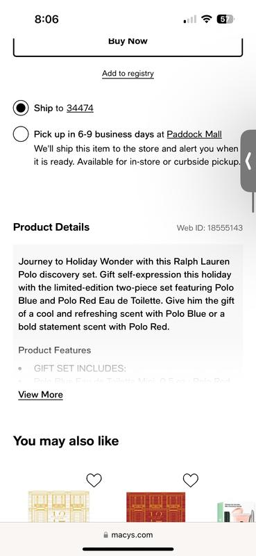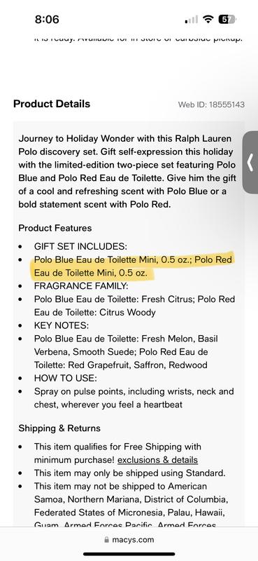 - Polo Blue Eau de Toilette Mini, 0.5 oz.; Polo Red Eau de Toilette Mini, 0.5 oz.