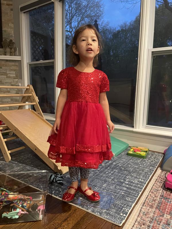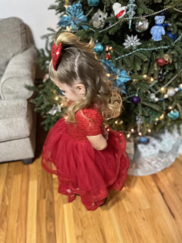 Spectacular dress! Purchased for twin 6 yr old granddaughters and they wore for Christmas and Valentine's Day. True to size, doesn't itch and paired it with white tights, red shoes and red hair bows. They are also wearing to Father/Daughter dance at end of February. Girls love them.