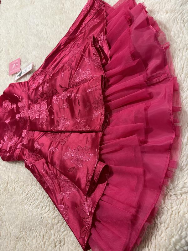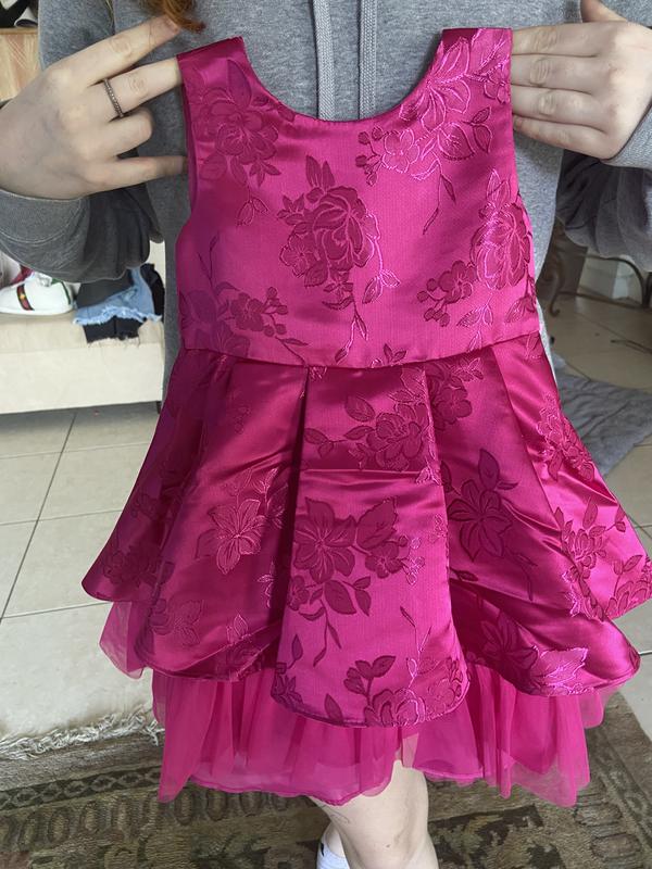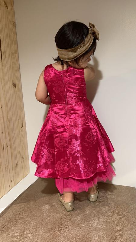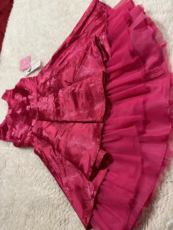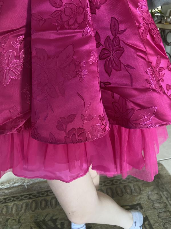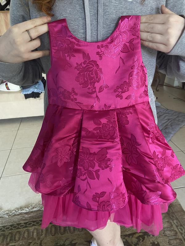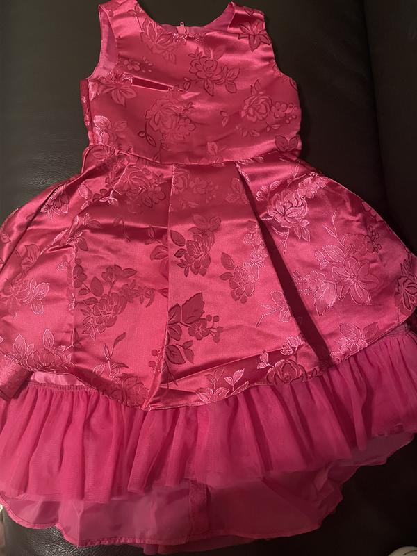 Super cute hot pink dress for my little girl. Perfect for Easter. Good for warm weather in florida because it is sleeveless. Great detail with brocade and tuille accents. Easy on easy off with back zipper. Vibrant pink color