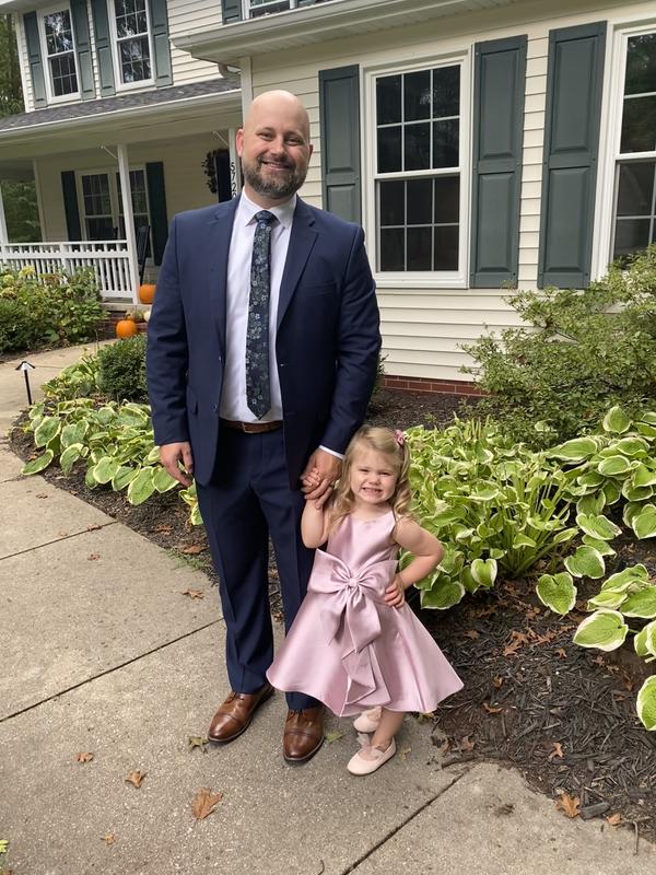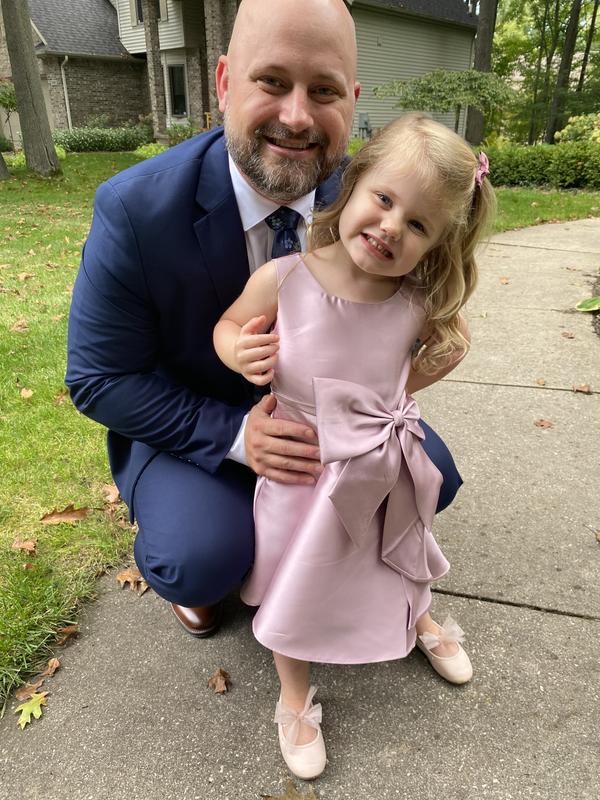 Beautiful dress. Thick, satin material that is still flexible. True to size. Classy length. Our daughter loves it. Note: grass stain also came out easily