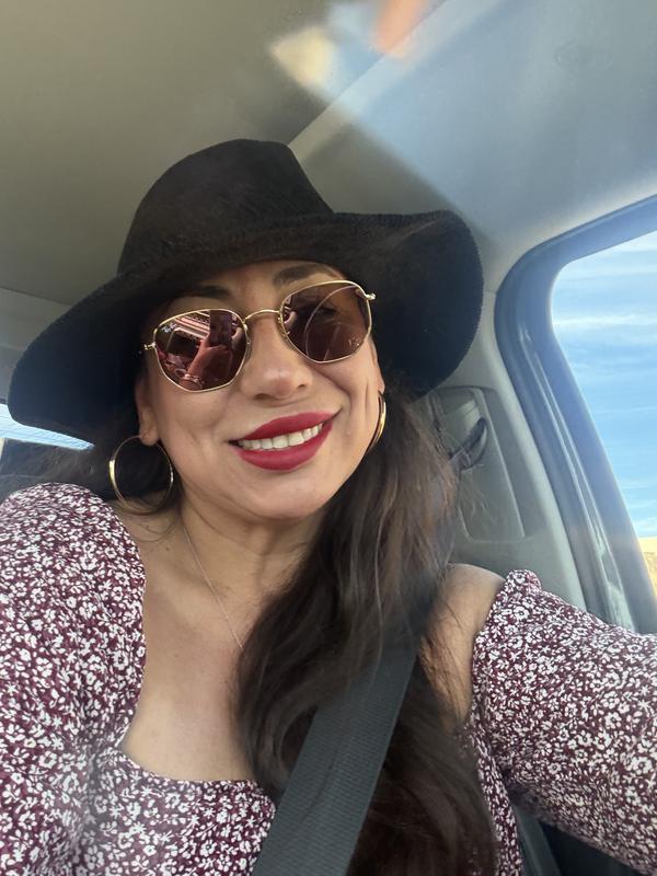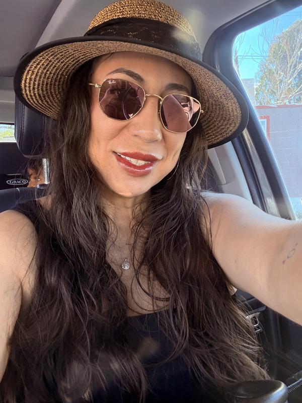 Love these sunglasses, the pink color is kind to my skin tone and I like the hexagonal shape for a change. Glad I ordered the smaller size, they fit my face much better!