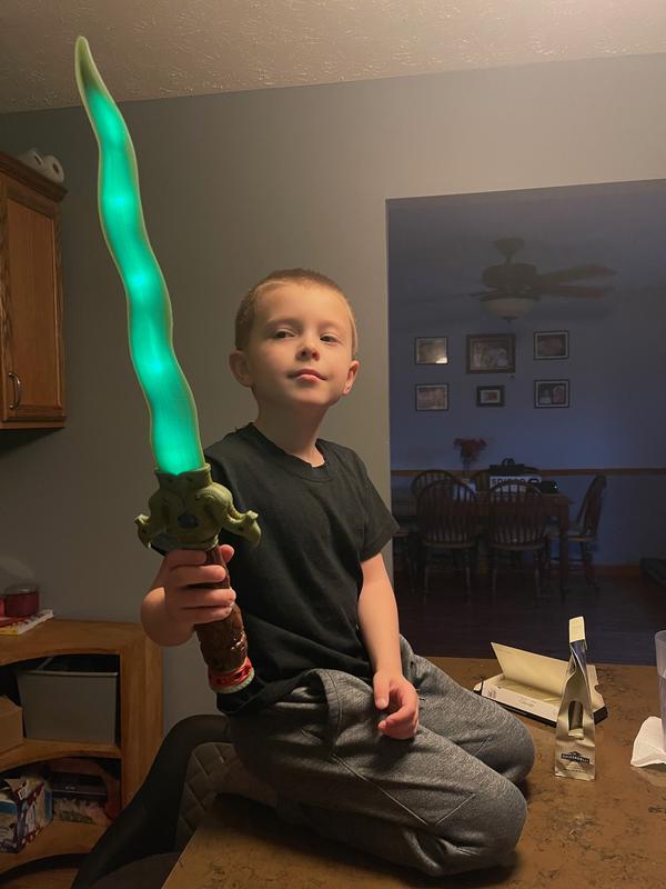 I got this for my kids for try they loved this it is so cute you push a button and the sword makes cutting noise and it lights up green . The sword is very pretty in the dark my girls love playing outside with this it's fun for all kids . This is hugh quality too it will last through many play days . Get this sword for your kids they will love playing with it .