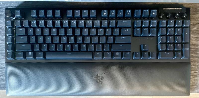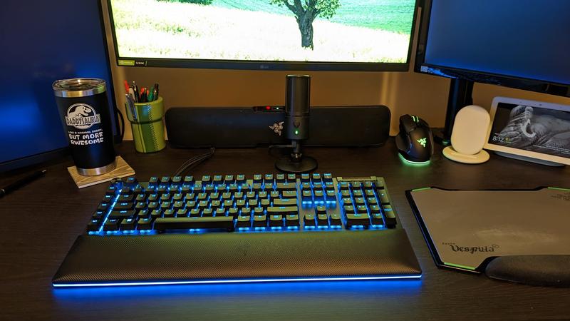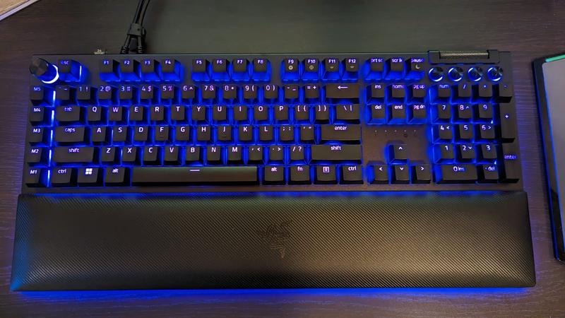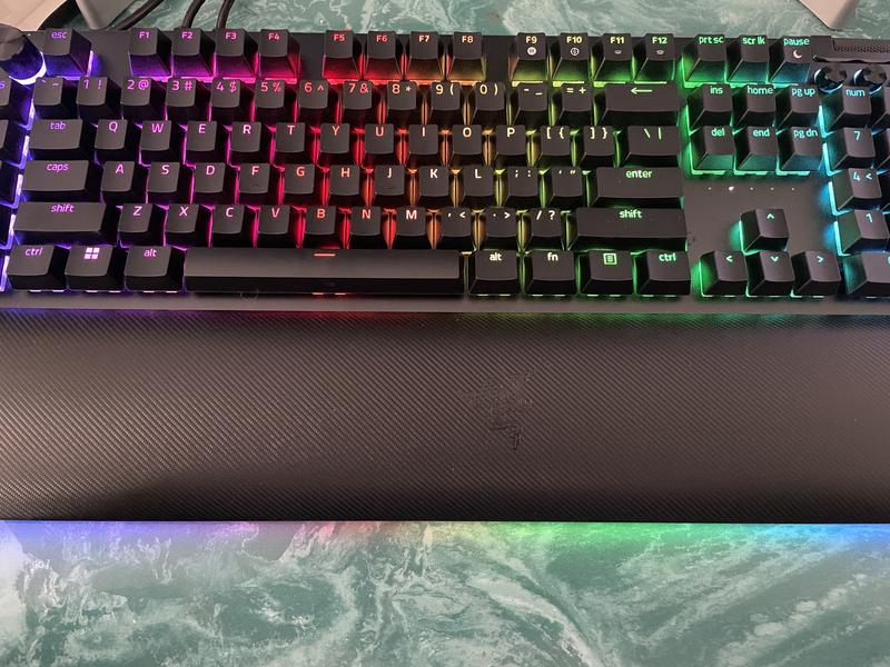 - Impressively high build quality - Razer Green Switches are responsive, fast, and "clicky" - Very low actuation point and required actuation force further making typing a breeze - Slight curve and ergonomics make it very comfortable, padding adds to this - Has endless additional keys and customizability options, perfect for gaming - Slightly rough texture to each key, did notice it helps with grip, but could be uncomfortable for some The Blackwidow v4 Pro is one of the best keyboards I have used in recent memory. Right out of the box, the build quality was impressively high. The cool metal and slightly grippy textures of the keys all felt premium and sturdy, which should be expected given the price. This is without a doubt a keyboard that will continue to perform after a lifetime of usage. The signature Razer Green switches are a perfect fit for the keyboard with their low latency and responsiveness. As a fast typer, I could really shine without being held back by keyboard constraints, and everything about the keyboard from key spacing to the slightly textured finish minimized typing mistakes. Coupled with an incredibly low actuation force and distance, typing on this keyboard is a breeze. The slight ergonomic curve and optional padding are also greatly appreciated, significantly increasing comfort for longer keyboard usage. When it comes to gaming, it has every bell and whistle a keyboard could need, from programmable custom keys and sliders to customizable and beautiful RGB backlighting for every key. While it is an expensive keyboard, the premium nature shines through every aspect of the product.