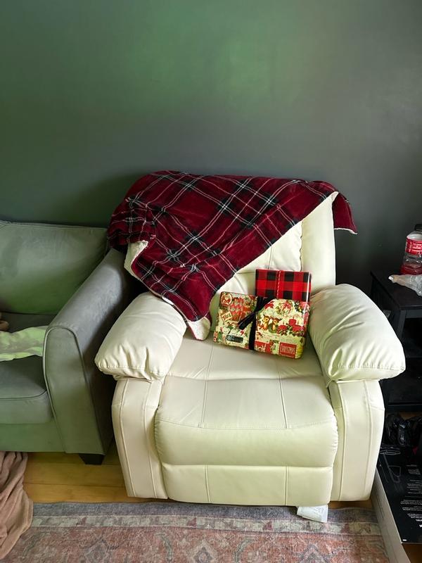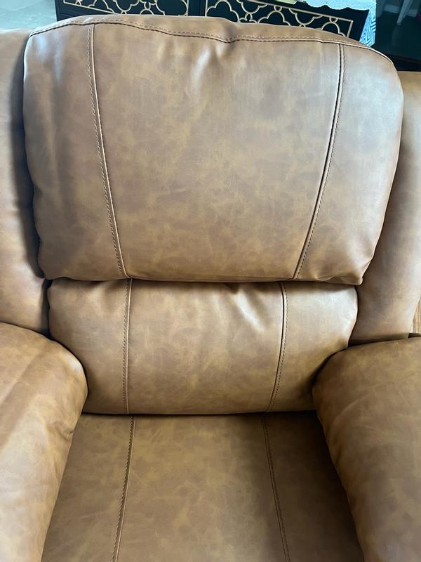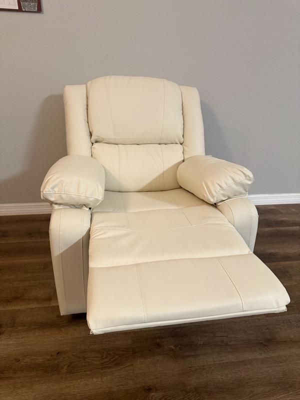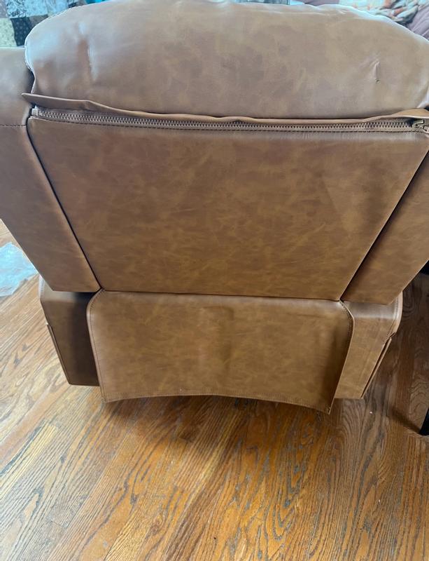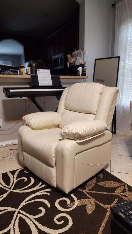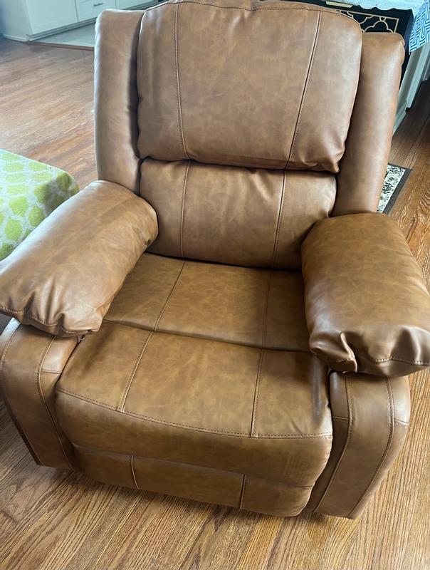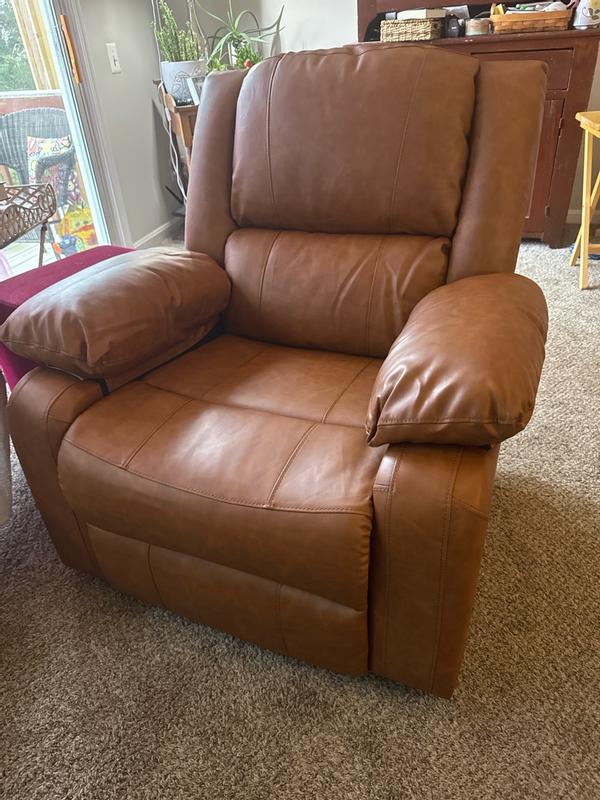 Love the color of the faux leather! It’s not an oversized recliner and fits perfectly in my townhouse. Wouldn’t be great for someone super tall, but perfect for someone who is average height! It’s pretty comfortable and I’d definitely recommend it if you’re looking for a comfy chair to put in a smaller space! Pretty easy to assemble as well!