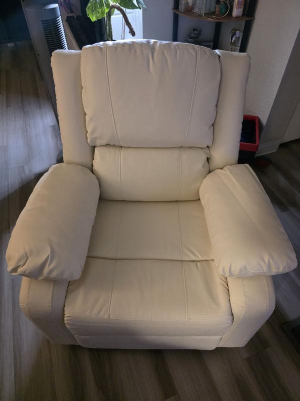 The back cushioning is so relaxing to entire back. The arm rests are so smooth and soft which is good for rest of elbows and wrists. It is made so neatly and looks elegant. It is big enough but doesn’t look bulky. It holds the weight very well and easy to get up. They are big enough to hold entire arms. It’s not high and feet can easily touch the ground. Material looks great leather and it will be so easy to clean it. I am confident that if it gets stains, it can get cleaned easily with just wet wipes. The material seems to be durable and long lasting. It reclines very easily with side button. I would like recommend it to others.