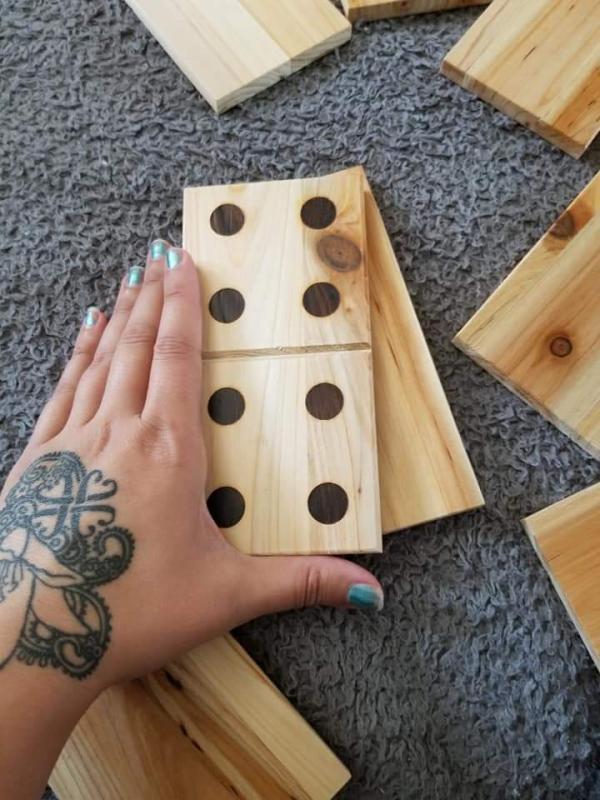 I got these awesome giant dominoes for camping and they are perfect for the outside game night. The smell of them is amazing they smell like they have been freshly cut from the wood. They come in a handy keepsake bag and they just make the game a lot more fun with there giant size with a family of 6 I need a bit more than 24 dominoes to play a big competitive game but we had A lot of fun as it is. Definitely a great game and could be a great gift for the outdoorsy person