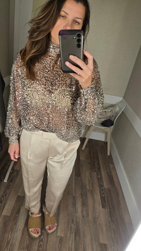 Absolutely gorgeous blouse. Sophisticated, unique, and it goes with everything. I’m a US size 8 in Reiss and in every top I own from this brand. For this one, I purchased a US size 6 (pictured below), as the 8 was too bulky. Love this top!