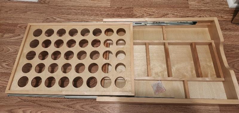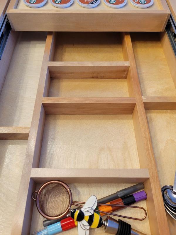 Rev-A-Shelf K-Cup Drawer Organizer is a two tiered drawer system. The maple wood drawer comes preassembled with the mounting hardware required for installation. At slightly over 8 lbs, this organizer is sturdy and very well built. Bonus are the soft close slides. This is a perfect addition to my espresso/ coffee nook. The top tier holds 40 coffee pods and slides back to reveal the lower drawer that is separated into 8 compartments.