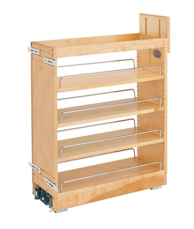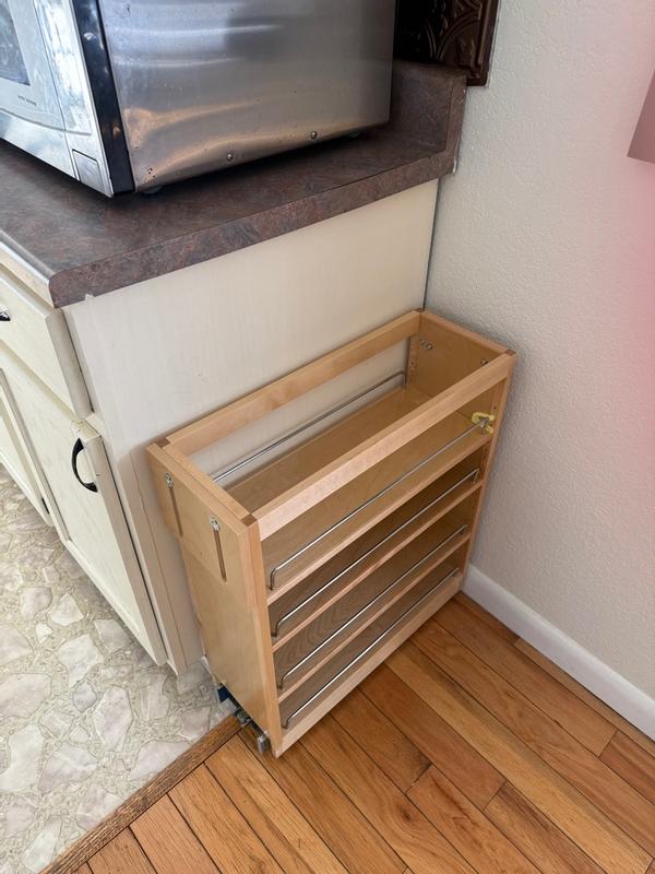This pull out organizer is perfect for small spaces! If you have a small kitchen like I do, you know every inch counts. The soft close is a really nice feature. The unit comes pre-assembled so you just have to install it into your cabinet box. The top three shelves are adjustable so you can make them whatever height you need!