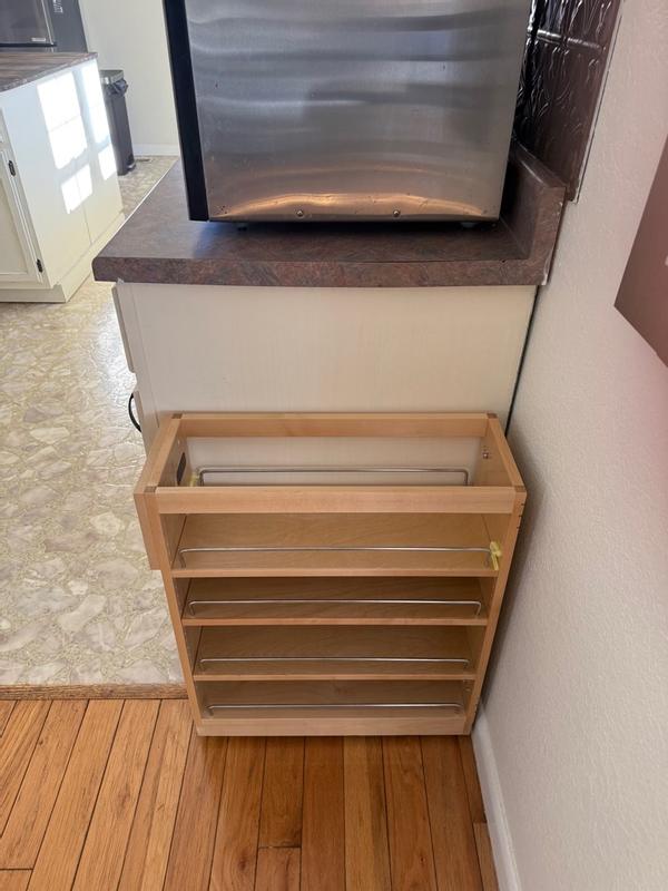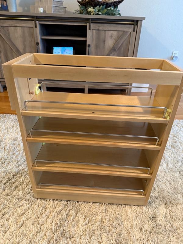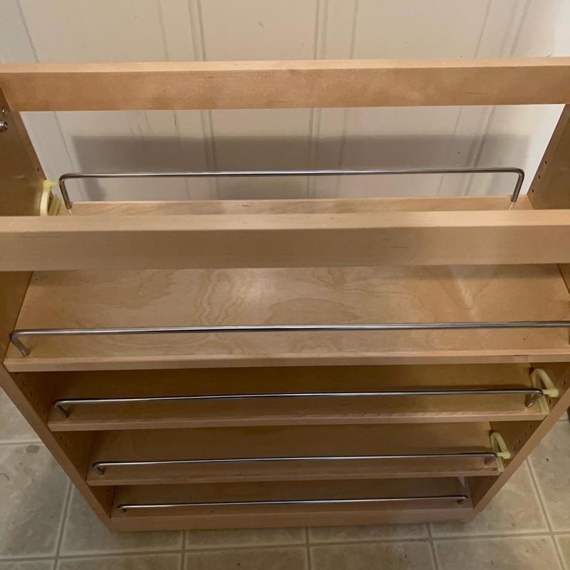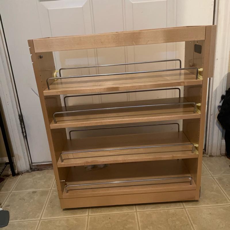 I received this product and was very excited to install it, but my cabinets are to short. So, with that being said we are building another cabinet and then placing this pull out organizer in it. The wood work is gorgeous and it is heavy! The cabinet is made extremely well.