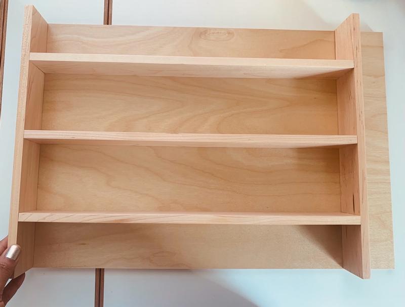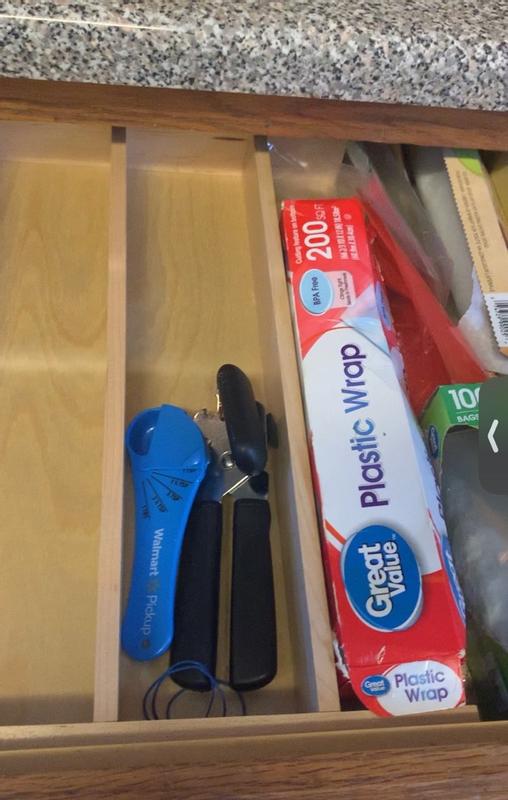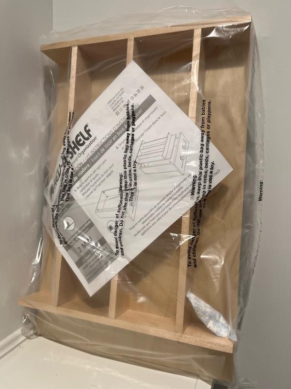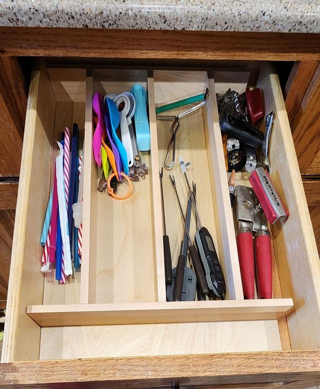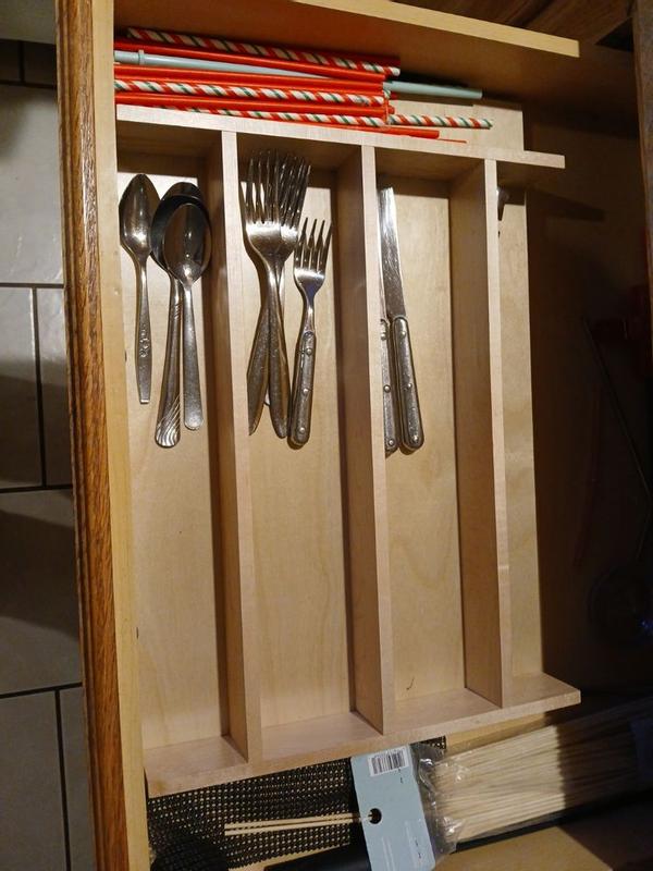 This unfortunately didn’t fit in the drawer like I intended.. I have very old kitchen cabinets too so my assumption is that more modern kitchens might not be a big of an issue. I thought about trimming this down with a saw, but the quality was so nice that I didn’t want to mess it up. I ended up using this in a dresser drawer of my son’s nursery to organize medicines, creams, and a bunch of odds and ends that were previously being stored in containers where things didn’t always fit well. Very sturdy wood and nice glossy finish! Wish I had a nice enough kitchen to be able to use these on utensil organization cause good quality ones are hard to find.