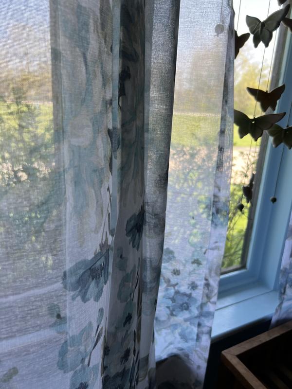 I love the colors on the Whimsical Sheer panel. The panels are lightweight and airy with different shades of blue watercolor flowers. There are also some grey tones in the panel and it went well with the grey sheers I already had. They let in lots of light and frame the window nicely.