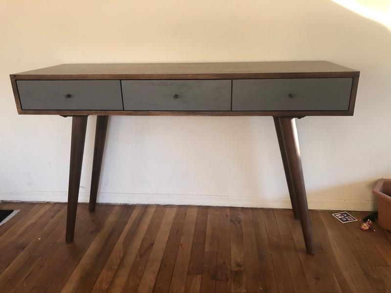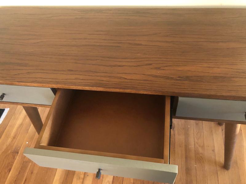 This is very elegant writing desk is a combination of mid century and modern time master piece. Made of real wood legs and well made pecan construction wood top, simple assembly required to fix just the legs, no instruction neccesary. It is a easy assembly anyone can do, even the neccessary tool is given along with the screws for the legs and the bronce knobs add more elegant to the writing desk . Love the pecan wood finish and the grey drawers for it . All i say about this writing desk is , it is well made furniture with also modern in look and add great addition to living room or office room. High quality wooden legs . Strong and sturdy