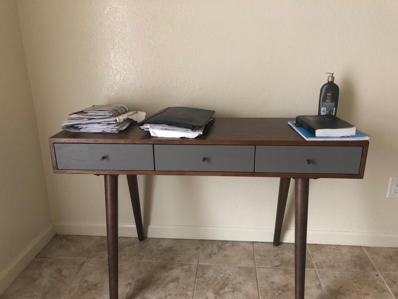I really love my new desk, I have been thinking for a while about putting one in my bedroom and this fits perfectly. I love the stylish look and the gray drawers match my gray walls almost perfectly! It was super easy to put the legs on and to screw in the drawer knobs. It’s very sturdy and not wobbly at all, also pretty heavy. Can’t go wrong with this desk, it’s a great addition to any home!