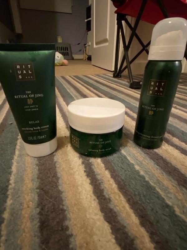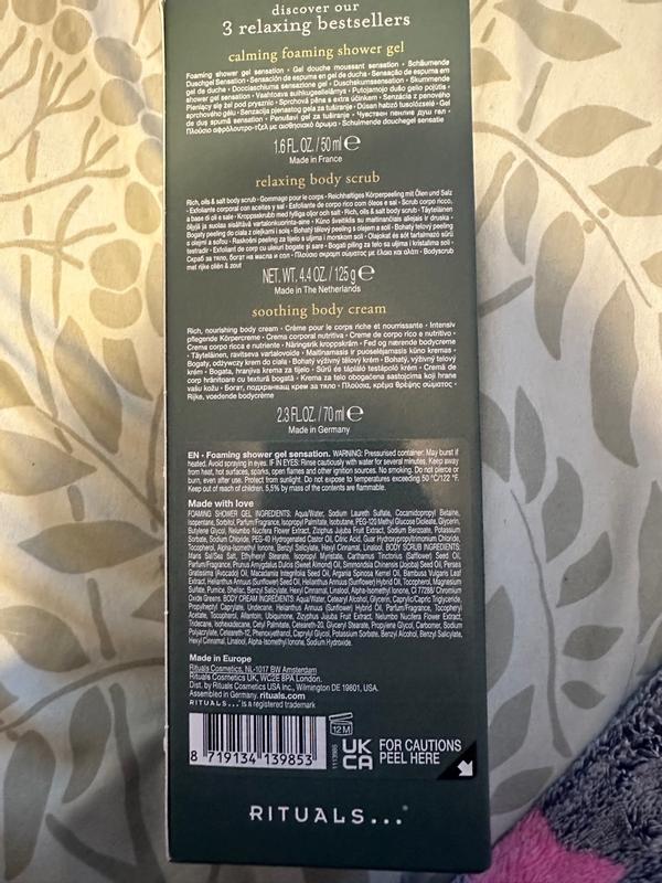 Beautiful little gift set. Smells amazing and fresh, the foaming body wash was also moisturising. The scrub was fantastic and also deeply moisturising too and my legs were so smooth afterwards, I also noticed my hair regrowth after shaving I didn't get any itchy bumps like I normally do, already gone to my local rituals shop to buy more and use it after I shave my legs. I'm sold absolutely love this brand so much ❤️