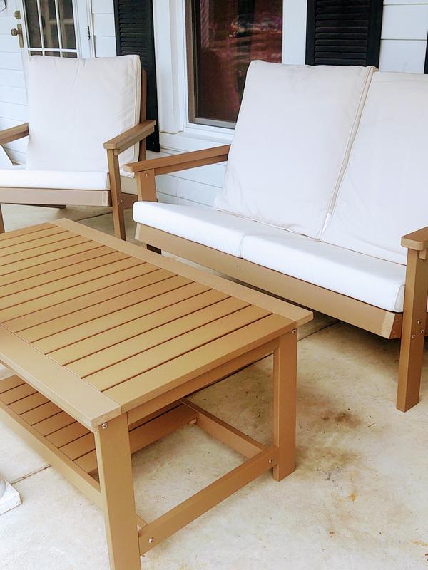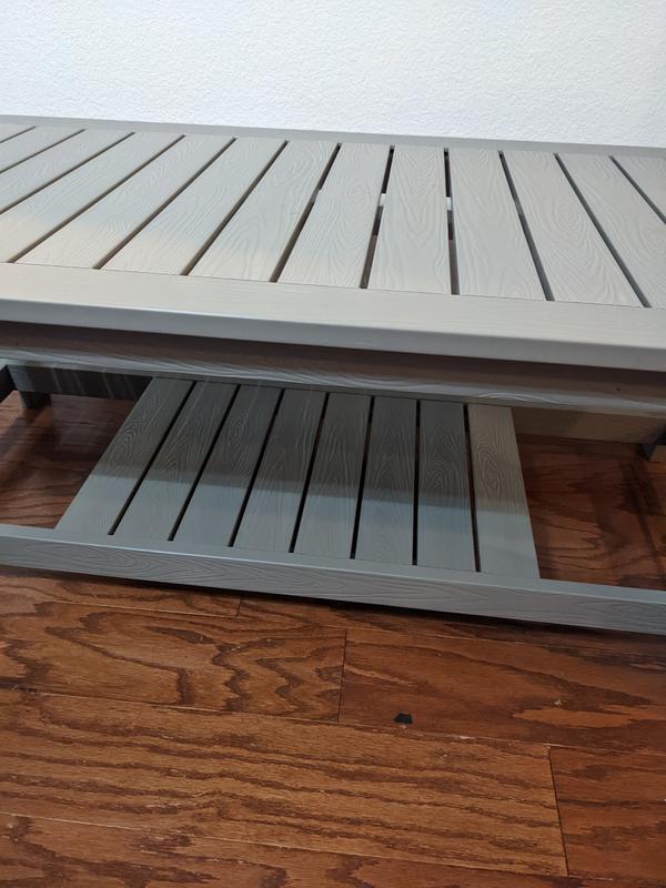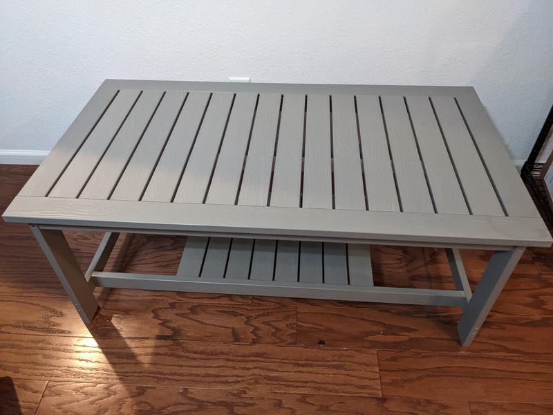 absolutely love this table! It’s incredibly sturdy, with a solid build that feels like it will last for years. The poly resin material looks just like real wood but is far more durable—no worries about chipping or peeling. The two-tiered design is super convenient for added storage, and the slatted top is great for water drainage when used outdoors. I’m currently using it indoors as a coffee table, and it fits right in with my modern-rustic decor. It was also a breeze to assemble—took me less than 10 minutes. Whether you’re looking for something to upgrade your patio setup or just need a solid and stylish table for your living space, this one is a winner. Highly recommend!