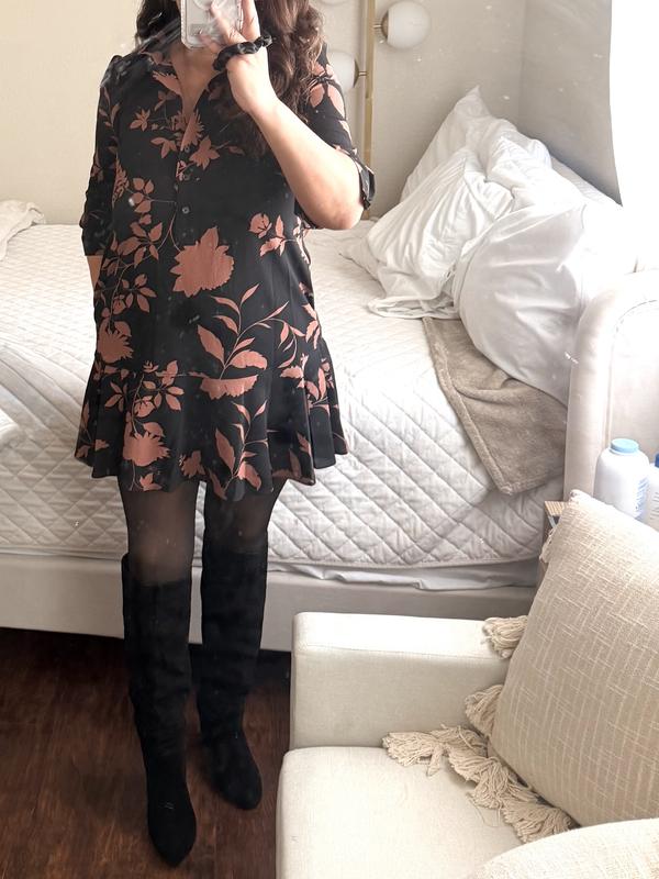 Lovely Comfort and Style. This is a nice 'dressy casual' dress, perfect for Fall. Purchased Size 8 Petite. I am 5 ft, 123 lbs, I could have sized down to 6P but did not want to risk it being too short, either size would have fit my frame. Love the color combination.