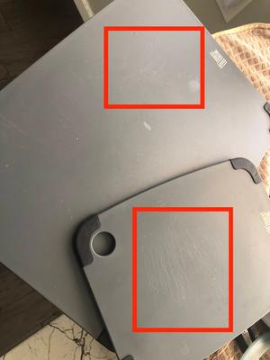 The rubber grips are designed to be removable with the ability to snap on and off. All cutting boards will show cutting marks through usage however feel free to contact us at info@camsil.com with any additional issues or questions.