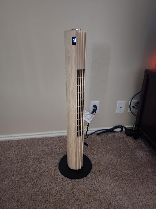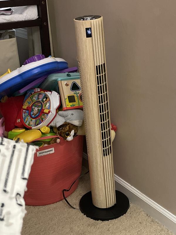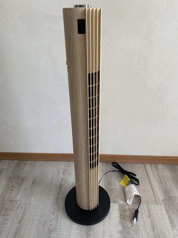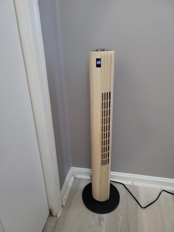 I am in love with this fan. It’s stylish with the wood graining and the black it’s powerful and quiet. I love that it can be oscillating or just stationary. On the highest setting you can definitely feel it across the room and it is so quiet. It’s great having a timer on it, the remote control is a plus so you don’t have to keep getting up and adjusting it if you need to and I love that it tells the temperature of the room that it’s in so you know if it’s cooling down in that room or not. This is the best fan I have ever had and I will definitely be getting another one.