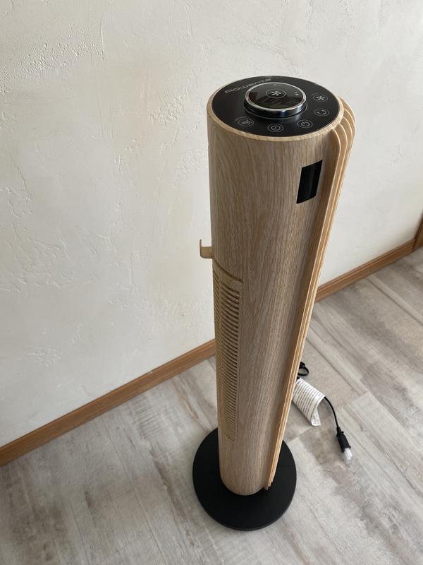 It gets pretty hot and muggy from humidity pretty bad where we live but try to avoid putting the air conditioning on until we absolutely have to. The key for us is to have fans going to help circulate and cool is down. This fan was much needed and we’ve used it in the main living room and bedrooms. The wood look to the main tower looks very nice, not cheap looking at all even though it’s actually plastic. The base being black is a nice touch. Fits in with so many different styles of decor. It’s a nice touch having a remote control though I am not able to use ours due to it not coming with a battery and I don’t see anywhere listed where it says which battery it takes (it’s the disk batteries). That is a bit disappointing. Even so the controls are easy and simple to use. Having three settings of fan speeds (1,2,3) and a natural wind setting which alternates between the three. It oscillates quietly though putting the wind speed up to three creates a higher pitched whistling sound which is a little annoying. The lower settings are very quiet. Definitely strong enough air speed to keep you cool. Overall really happy with this fan, though will be MUCH better once I can figure out which battery to use with the remote.
