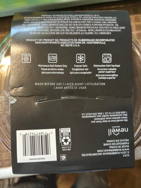 Nicely made Rubbermaid dish doesn’t stain doesn’t melt in the dishwasher. Has a really nice lid. Holds almost 7 cups. You can put it in the microwave seals really well. The latches work really well.